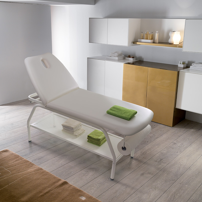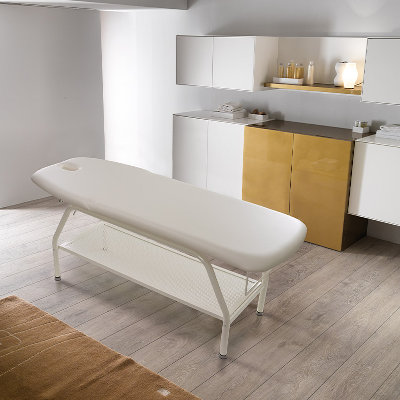Masa Well este echipată cu o saltea din două secțiuni cu o gaură pentru față. Liniile sale curate și esențiale îl fac ideal pentru tratamente corporale și masaje, garantând confort total clientului atunci când se află în poziția culcat. Capac pentru găuri pentru față disponibil la cerere.